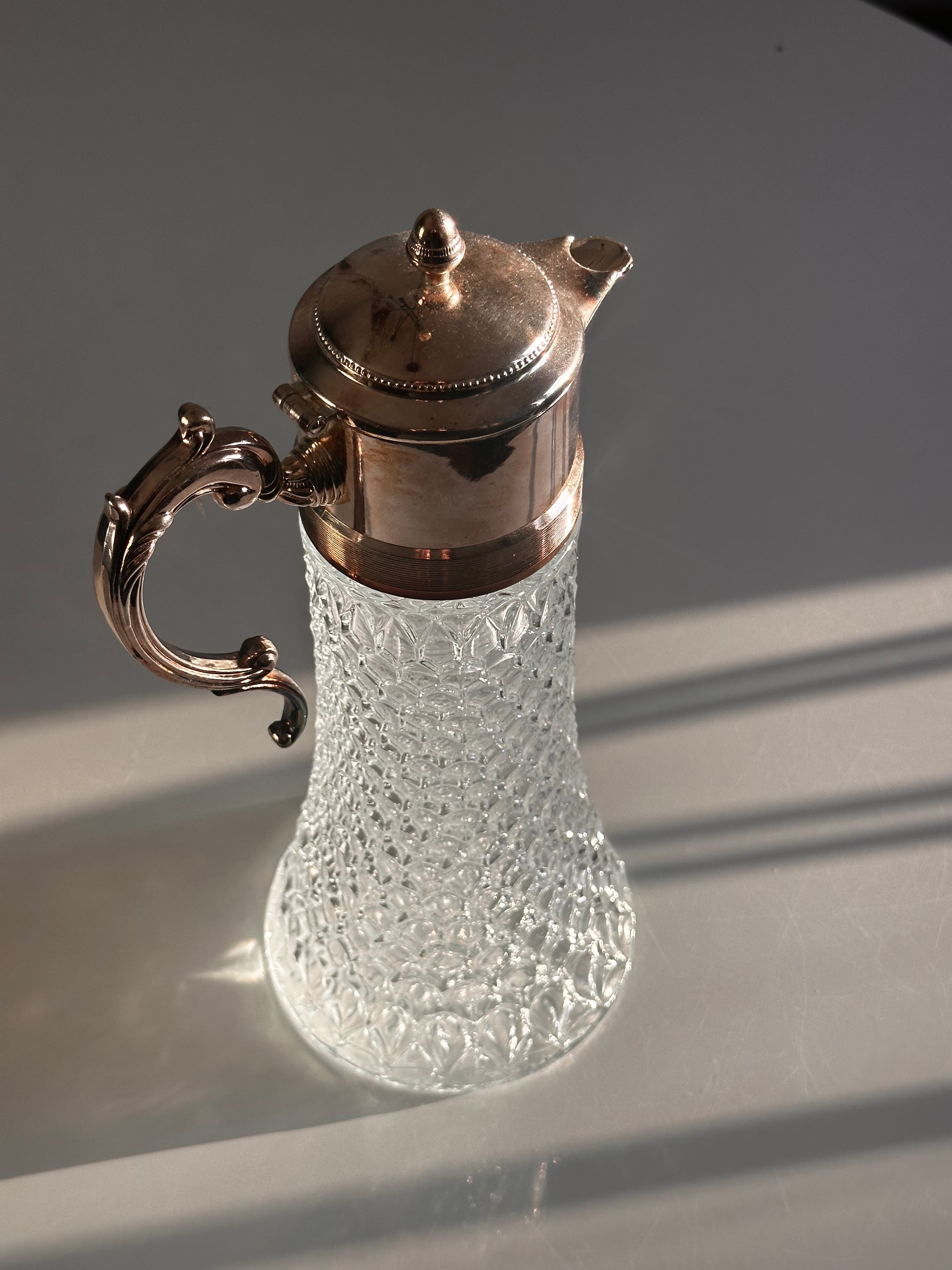 A cut crystal claret jug with a faceted body and gently flared base, topped with silverplate mounts, hinged lid, and scrolling handle. The textured crystal catches light beautifully, while the warm patina to the silverplate adds depth and character. Classic in form and scale, this piece works well styled on a bar, sideboard, or dining table, whether used functionally or as a decorative accent.