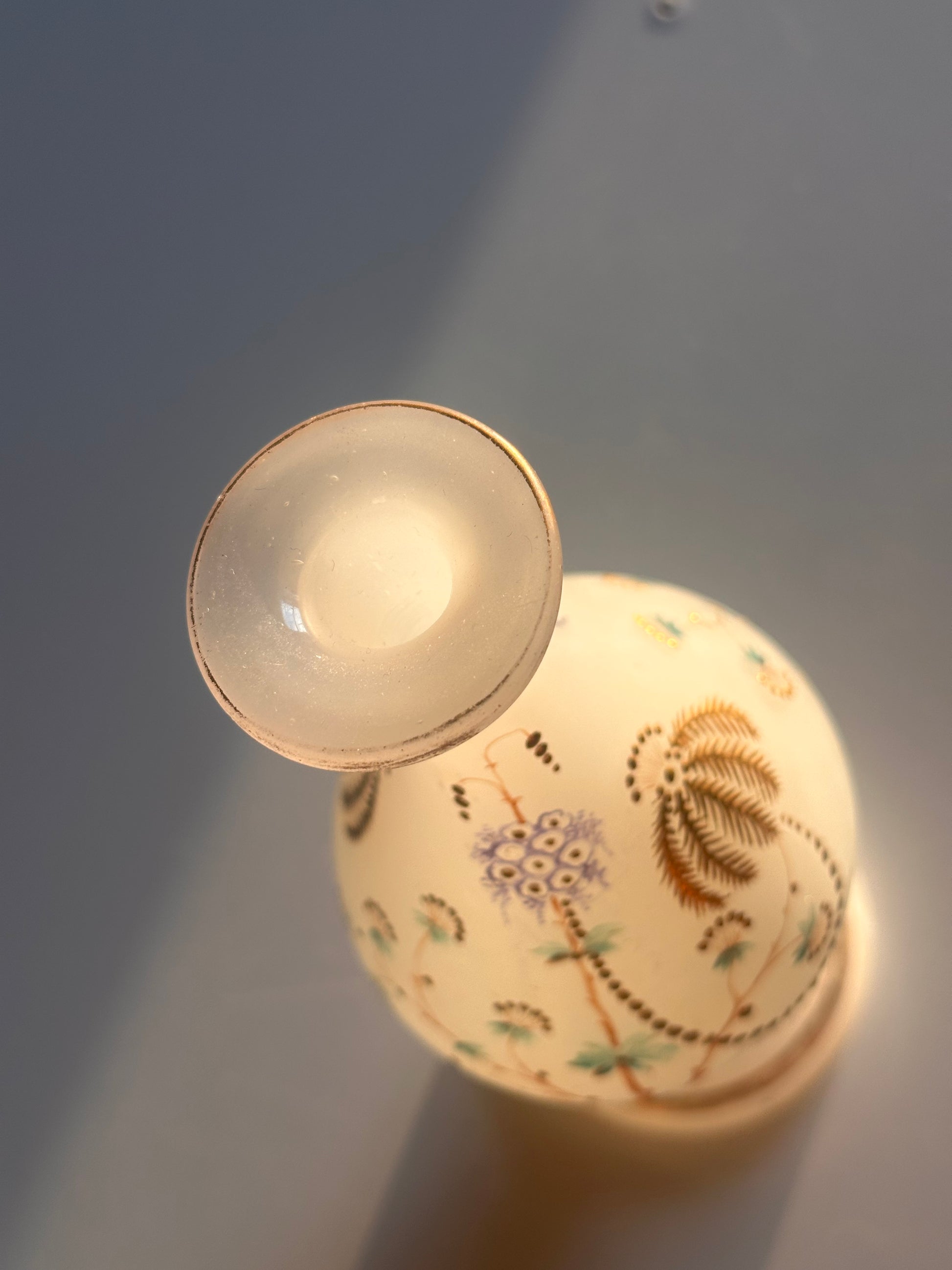 A delicate opaline glass bud vase, hand-painted with fine botanical motifs in soft earth tones and muted blues. The milky white glass glows warmly when lit, showcasing the depth and translucency characteristic of true opaline.