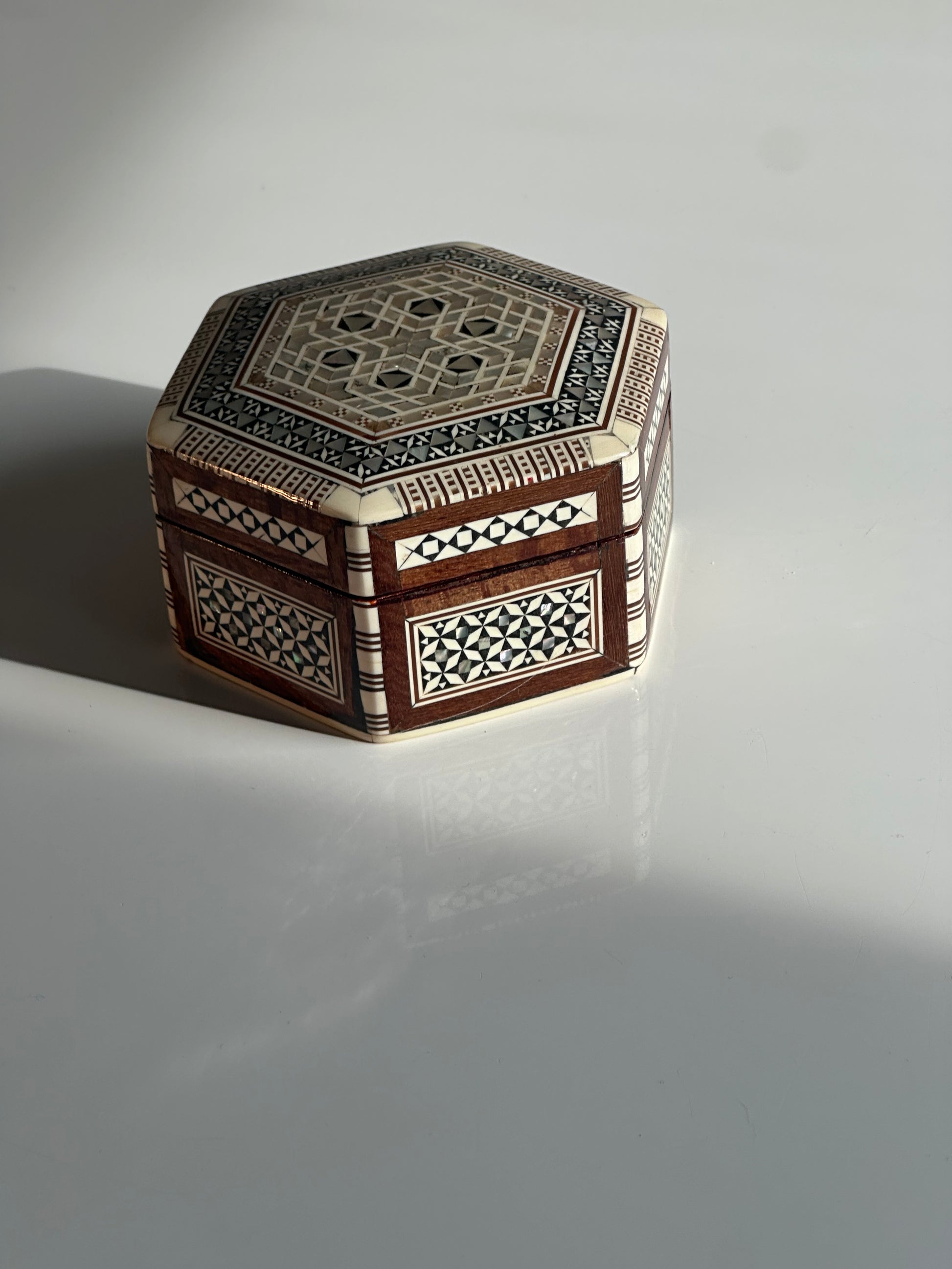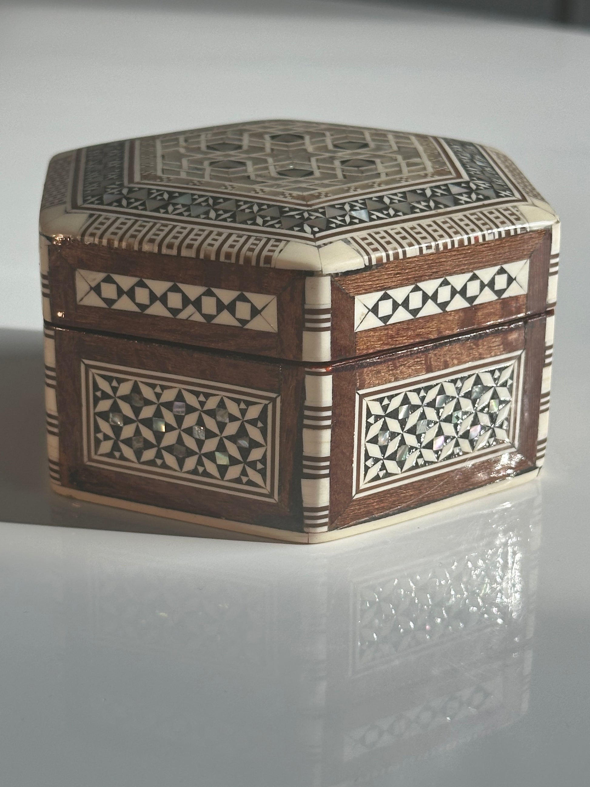 A beautifully crafted hexagonal inlaid box, featuring intricate geometric patterns formed from mother-of-pearl and bone inlay set into a warm wood ground. The hinged lid opens to a velvet-lined interior, making it ideal for jewelry or keepsakes. The exterior mosaic reflects traditional Middle Eastern design motifs, executed with fine precision and symmetry.