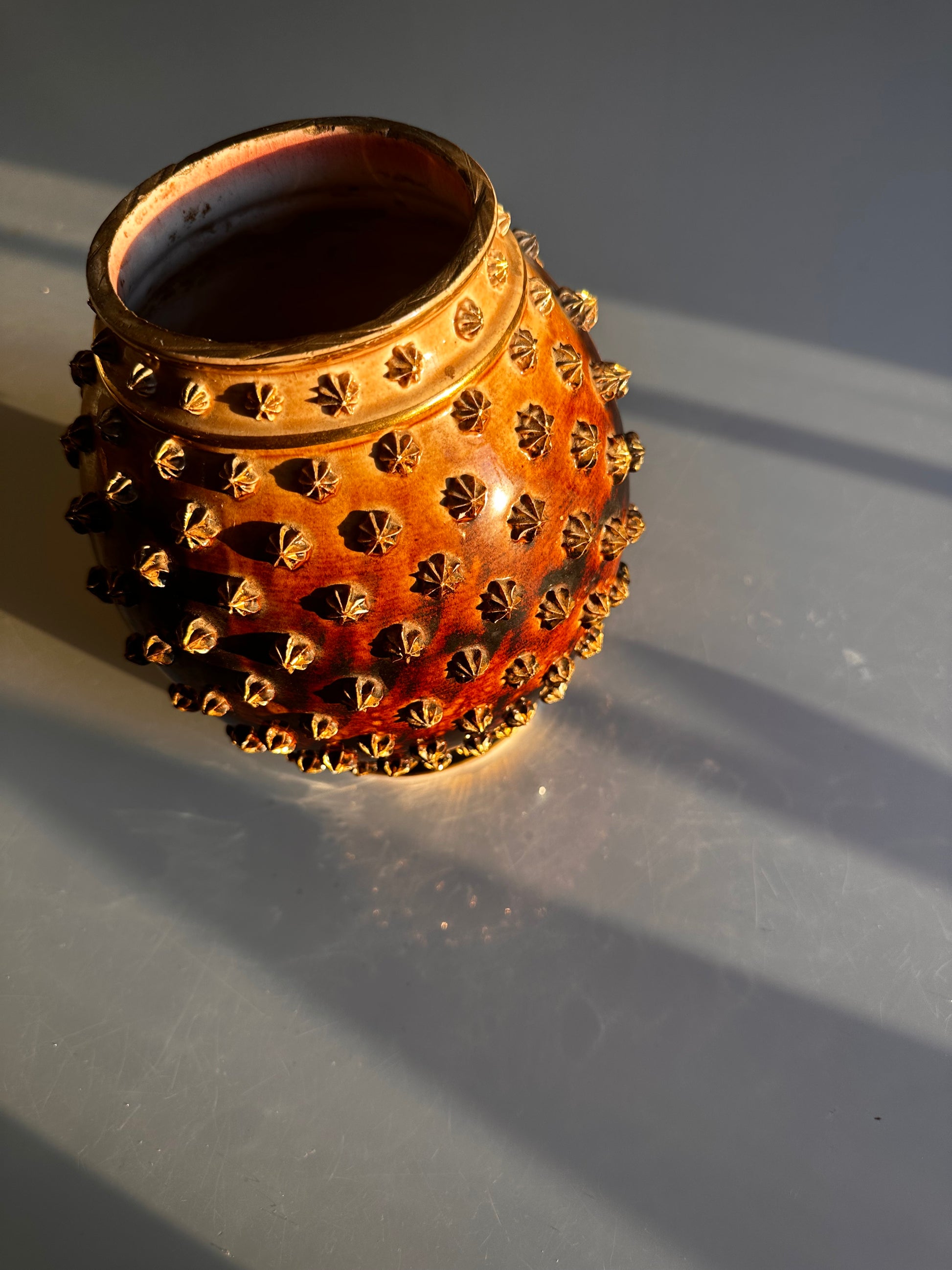 A richly toned vintage glass vessel in deep amber hues, adorned with raised stud detailing that catches the light beautifully from every angle. The surface texture and warm coloration create a sculptural presence—equally striking styled alone or layered into a collected vignette.